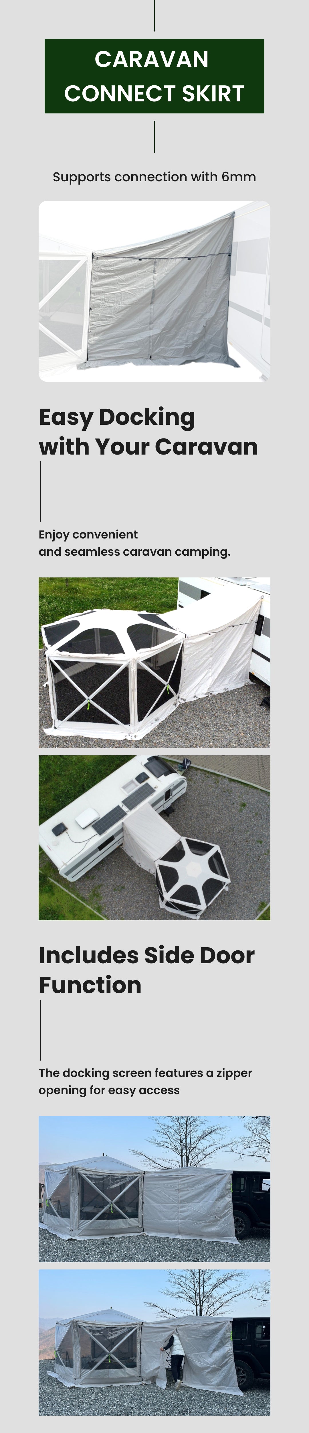 This skirt easily connects your tent to a caravan, expanding your space and making movement more convenient. The zippered opening allows for simple access while providing excellent sealing. All accessories are compatible with the Octa 3619 Tent and may also fit other tents depending on their design.